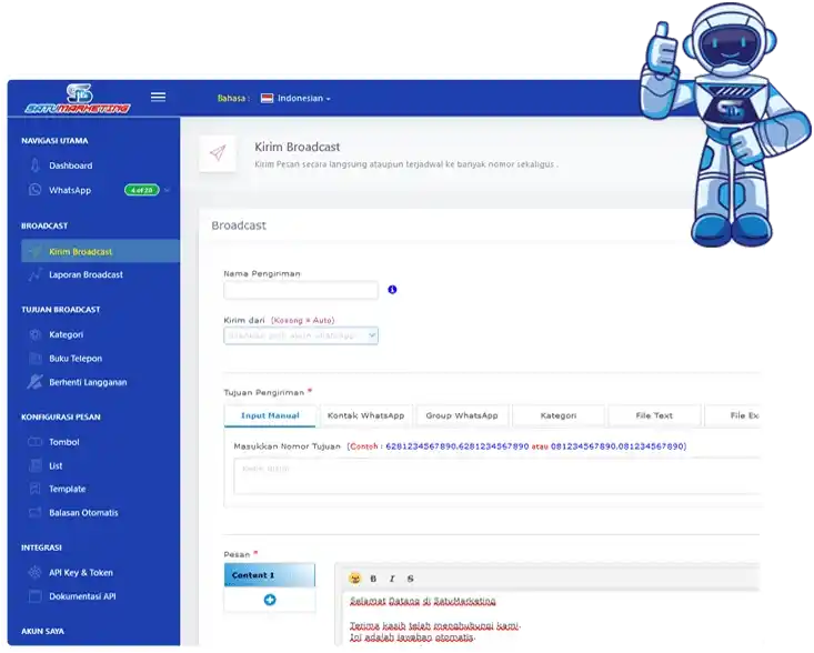 SatuMarketing adalah tools whatsapp marketing yang di gunakan untuk mengirim pesan ke banyak nomor whatsapp dengan sangat mudah, hanya dengan sekali klik.
